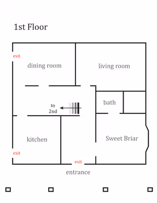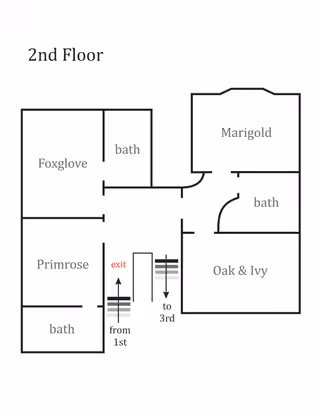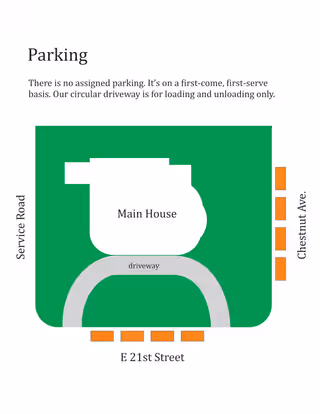 Find your room at a glance and see where to park when you arrive. The main house features first and second-floor rooms, with accessible parking on E 21st Street or Chestnut Ave.